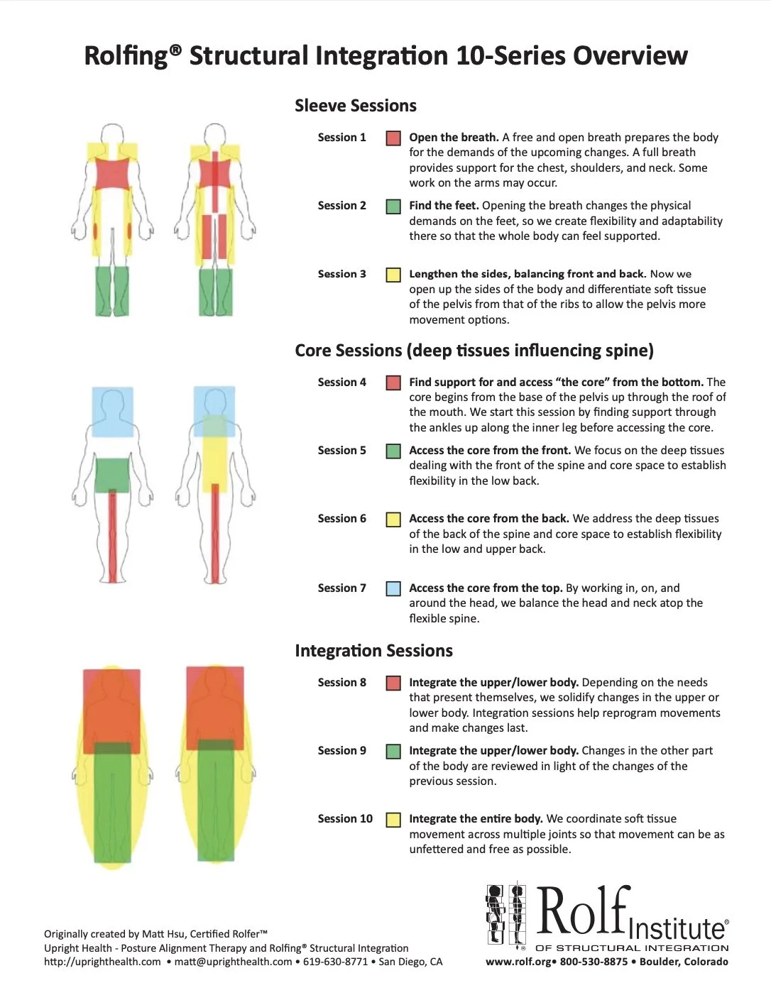 Each session of Rolfing begins with an assessment of the client’s individual structure. Sometimes, clients are asked to move in specific ways and specific areas may be palpated. Most of the work is then accomplished with the client lying on a massage table, sitting on a bench, or standing and moving in directed ways while I work with my hands to address specific areas of the body. The client’s sensations can vary greatly from pleasure to burning, but should not require bracing or tightening anywhere in order to be received.